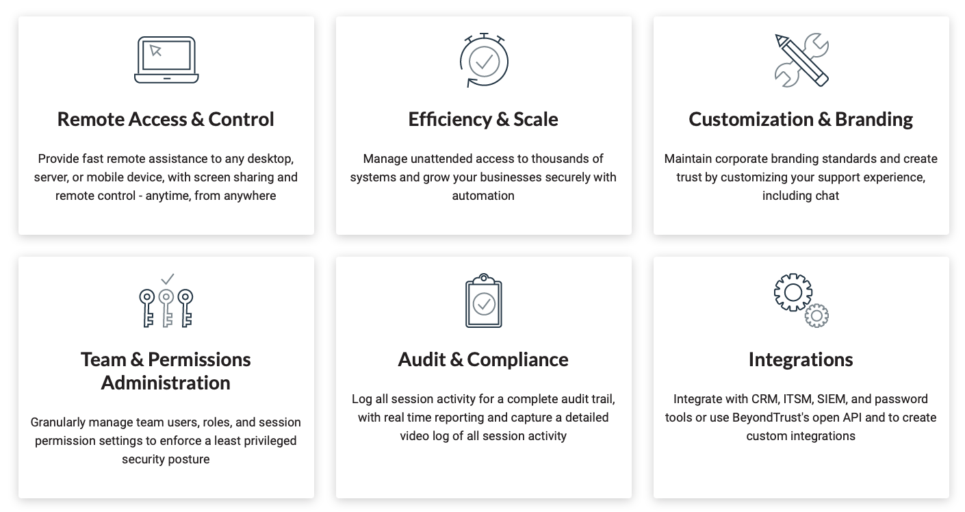 BeyondTrust Remote Support empowers help desk teams to quickly and securely access and fix any remote device, on any platform, with a single solution. Organizations of all sizes can boost service desk productivity, efficiency, and security by consolidating and standardizing help desk support with BeyondTrust.